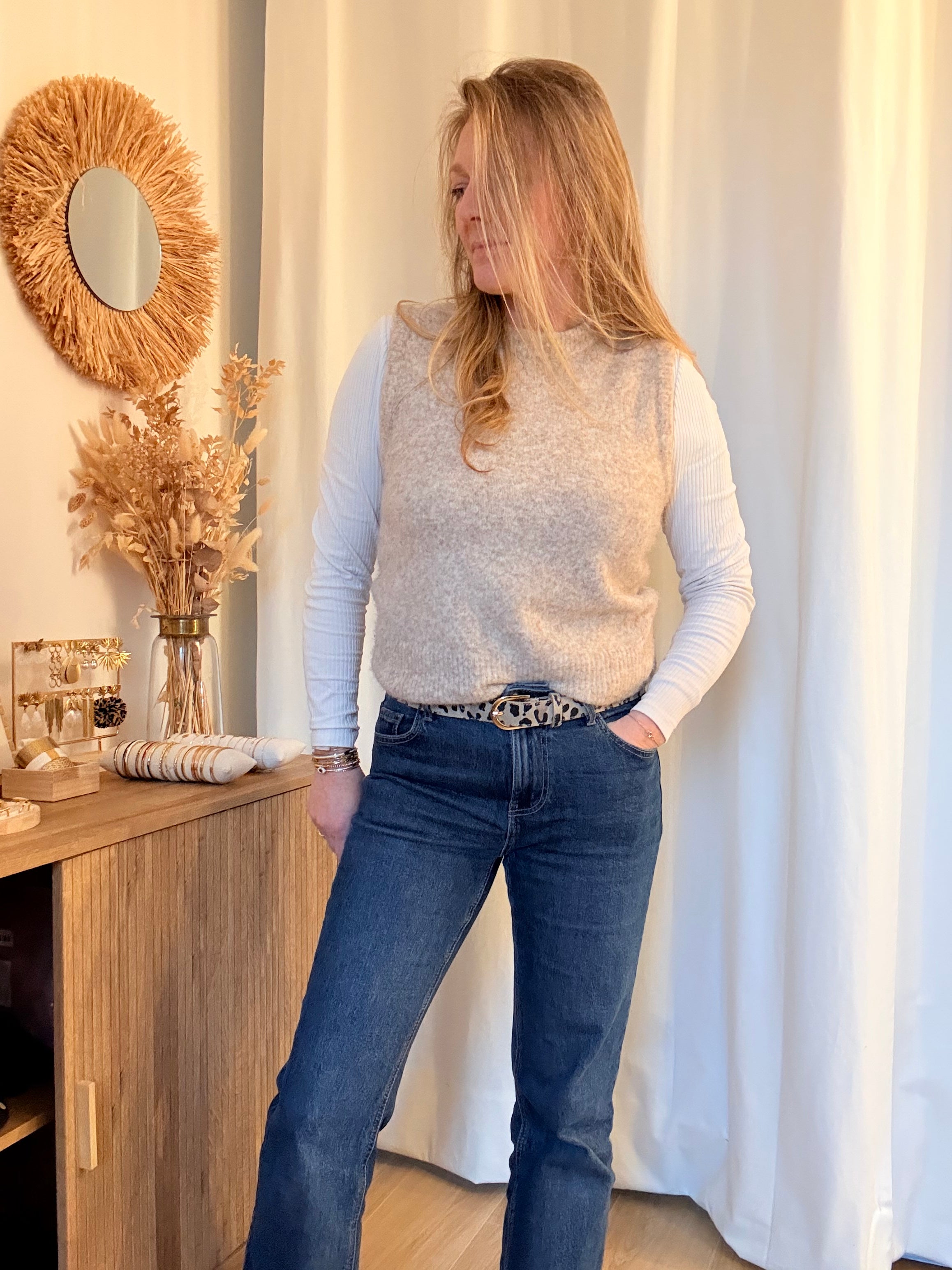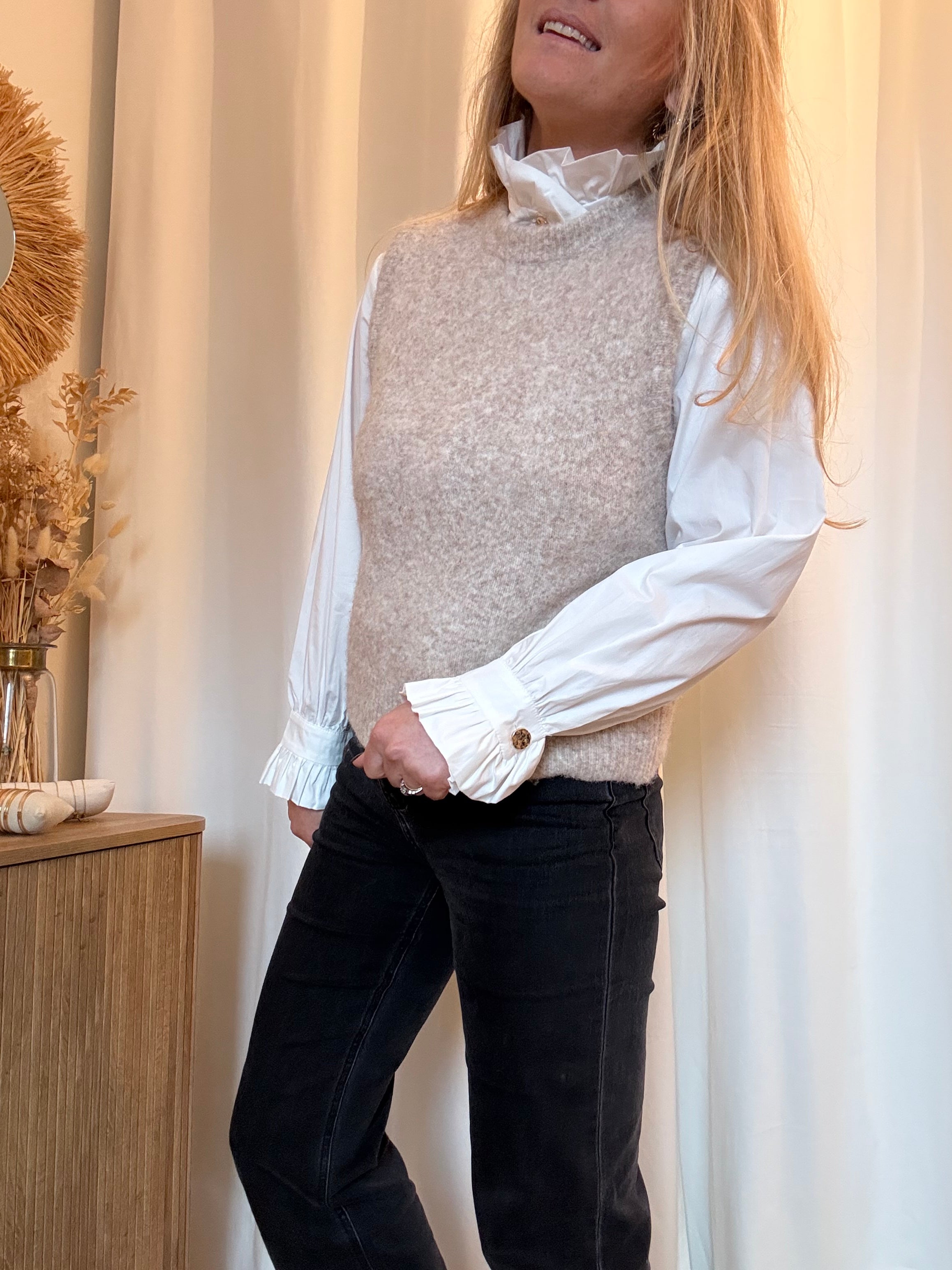 Pull sans manche Louise tout doux. On adore cette pièce beige chinée, facile à porter avec une chemise, une blouse ou à même la peau.